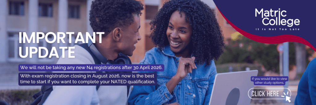 No, you cannot do NATED Courses without Matric. However, you can apply for a NATED Course with any Matric Pass Level. If you do not have a Matric Certificate, we will help you get your Matric by offering these (2) two Matric Courses at our college: